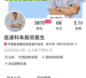 快手上时常会看到一位每天都会科普的医生,他在抖音平台上兢兢业业地更新着血液疾病相关的科普文案,视频真实记录着病房里的点滴,能看得出他是一位特别有爱有温度的医生,让更多人了解疾病发展情况,及时就医治疗。他在快手上的昵称是:“血液科朱振忠医生”。